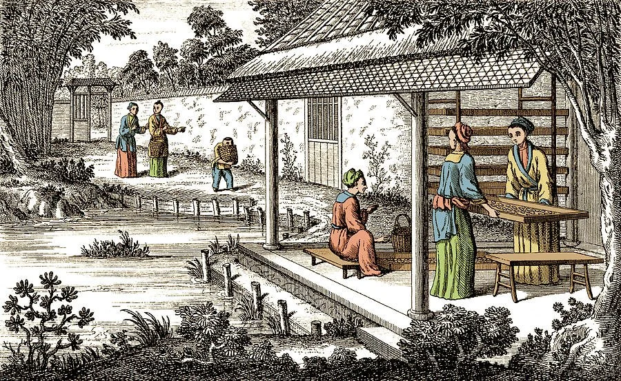 To execute this vision, the king relied on the French East India Company, founded in 1664 to rival British trade in Asia. By the 1730s, its ships reached Canton, where Chinese silk dazzled European markets, deepening France’s desire for the expertise behind it. Through governors or Jesuit missionaries bridging East and West, Louis XV likely commissioned a small group of Chinese silk experts to bring their craft to Louisiana. Maison Chenal’s mulberry grove became a testing ground for a small-scale sericulture operation, reflecting the king’s ambition to emulate Lyon’s silk legacy in the New World.